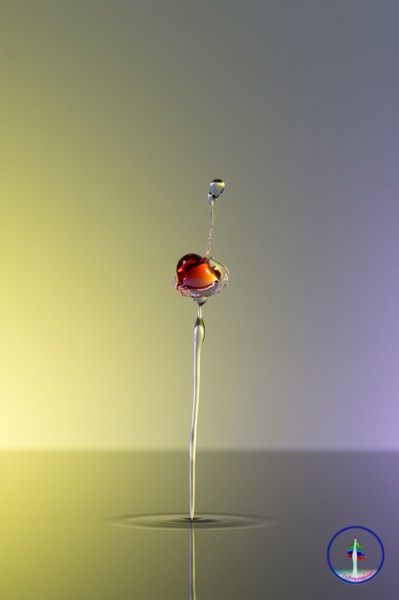 Auf einen von unten aufsteigennden Wasserstrahl fällt ein Tropfen