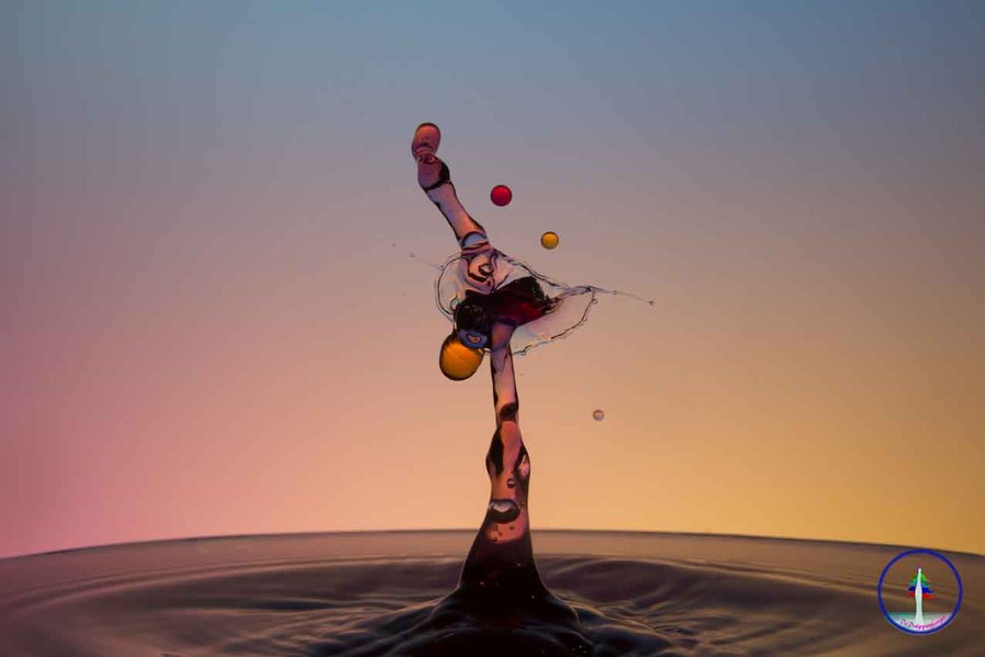 Eingefärbte Flüssigkeiten treffen aufeinander. Zusätzlich wird mit farbigen Blitzen gearbeitet.